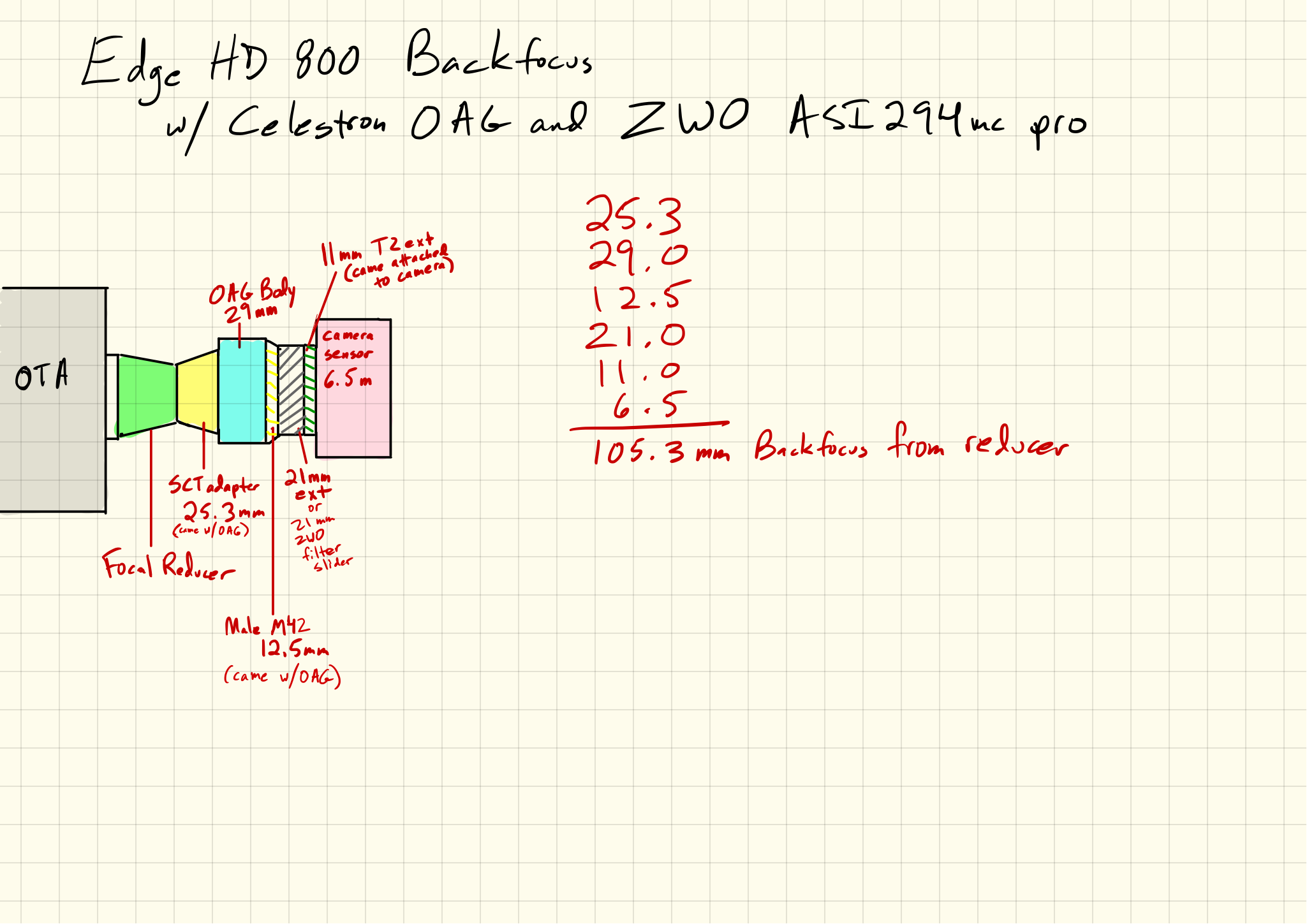 A couple of notes: the 11mm spacer in the diagram is not the camera ring - it is a standard 11mm m42 spacer (M to F). Since this configuration is a little short to spec, I added a 1mm "washer" spacer between the 11mm adapter and EFW. Honestly, I'm not sure if it made a difference, so that is certainly optional. It brings it to 105.3mm total back focus. The ASIair platesolves this at 1474mm focal length.