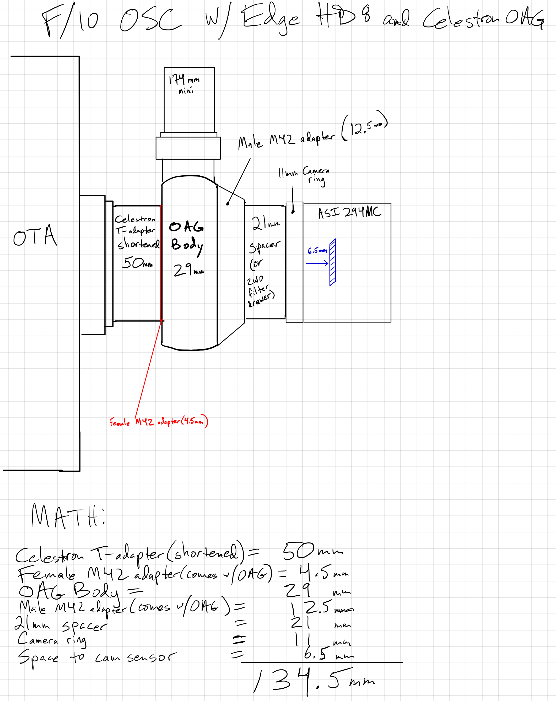 I've saved my diagrams that have produced excellent results for me over the past couple of years. I use the Celestron OAG on my rig, which comes with several adapters. I've tried to be very specific in these diagrams so that you know exactly which adapters you need.